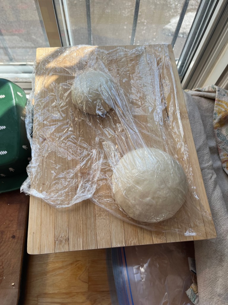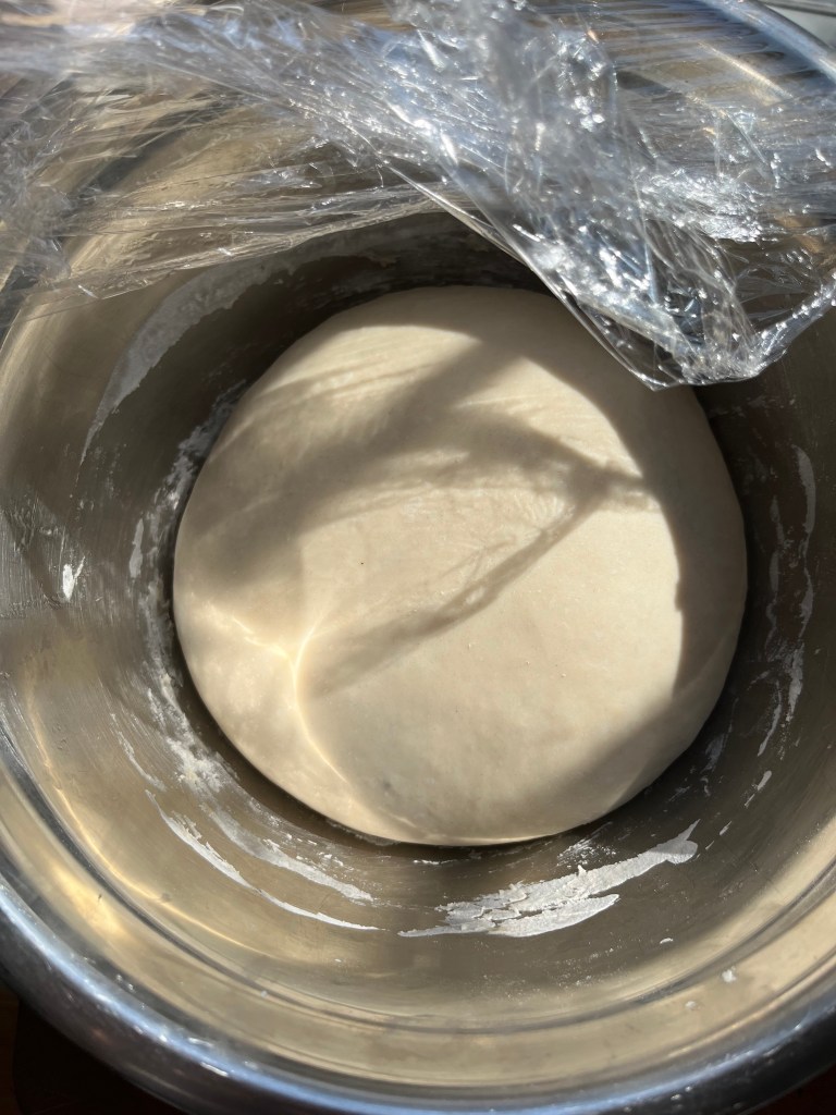 - Déposer la pâte dans un bol et recouvrir de pellicule plastique. Placer à un endroit chaud et humide*. Laisser reposer jusqu’à ce que la pâte ait doublé de volume. Cela peut prendre entre 1h et 3h dépendamment de la température de votre pièce.