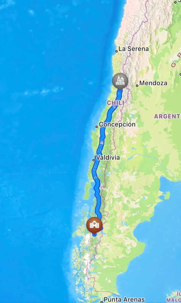 Le 2 janvier, mon copain, sa famille et moi sommes allés au Chili. Le père de mon copain est chilien, il vient de Talcahuano, mais il a aussi habité à Valparaiso. Il a donc été le guide parfait pour ce voyage. La famille d’Esteban vont relativement régulièrement au Chili pour visiter les abuelitos, les tios, etc. C’était pour moi la première fois que je visitais ce magnifique pays. Pour faire bref, les régions qu’on a couvertes sont de Santiago jusqu’à Puerto Tranquilo donc le début/milieu de la Patagonie.